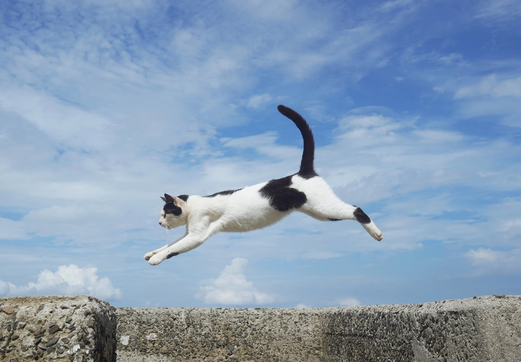 猫は自分の体高の約5〜6倍もの高さへ跳躍できると言われています。換算すると1.5〜2mほどを助走なしで跳び越える能力です。これは人間でいえば建物の2〜3階に一気に飛び上がるほどの力であり、高所からの脱走も容易に行えてしまいます。