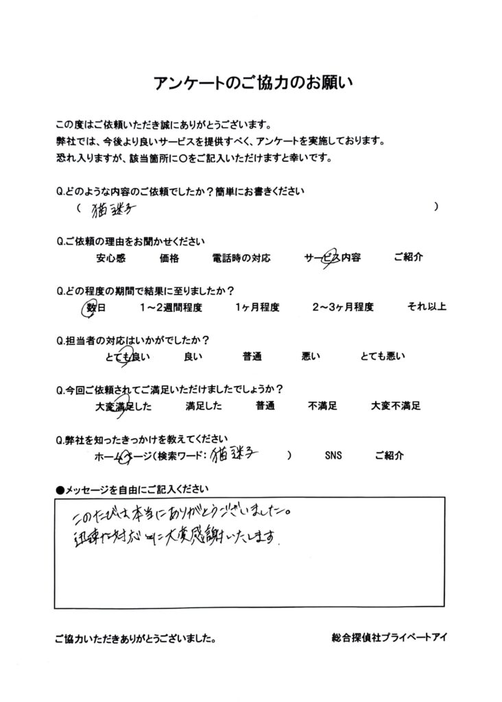 今回のご依頼は、年末年始に帰省した際、実家で猫が脱走してしまったケースでした。